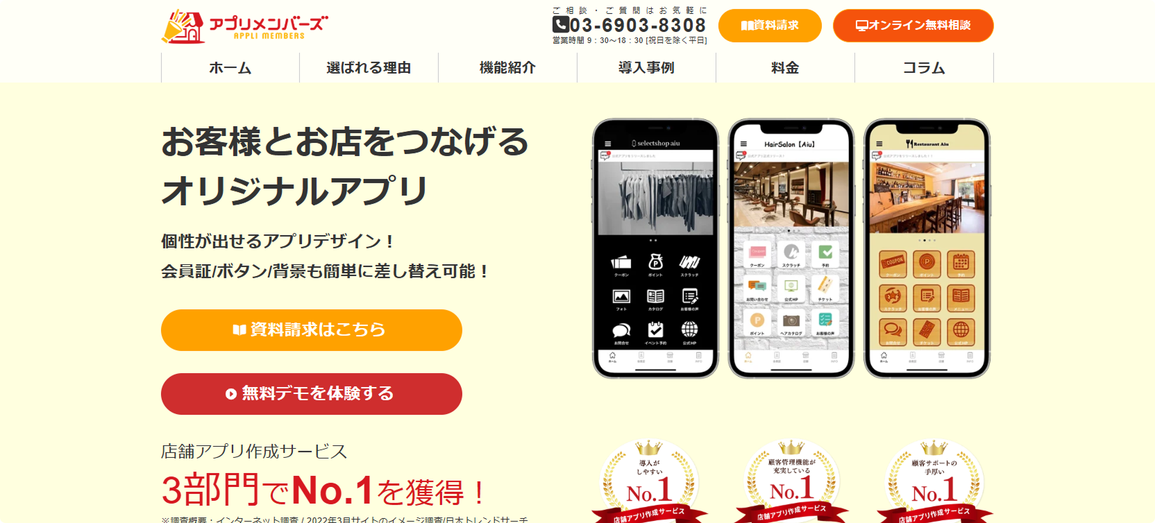 セミオーダー型で、スタンプ・クーポン・プッシュ・予約など販促に必要な機能を網羅します。申請代行/短納期にも対応しており、初めてのアプリ導入でも運用開始までのハードルを下げやすいです。大手グループのサポート体制も安心材料です。