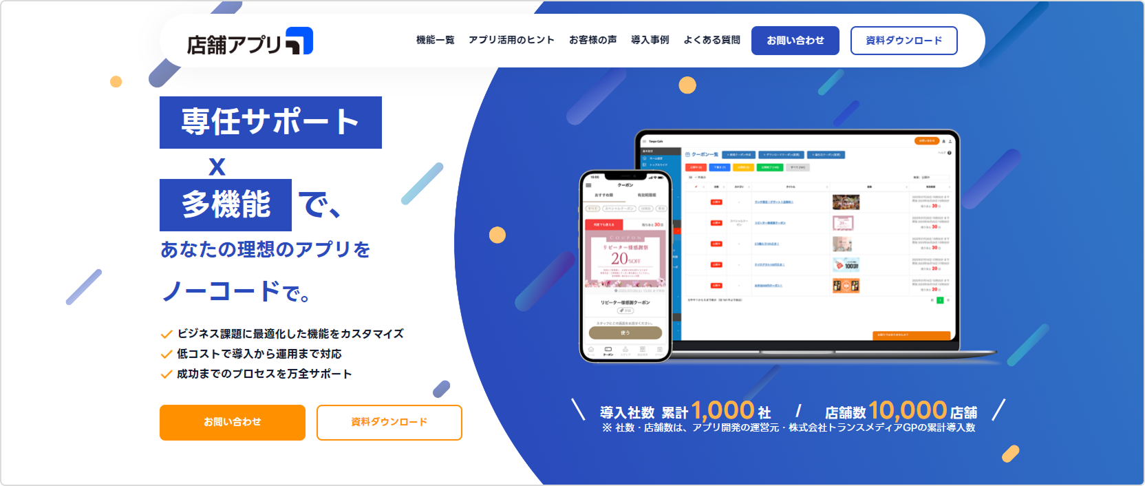 店舗アプリ専用ではなく汎用ノーコード開発基盤で、PWA/iOS/Androidに対応します。外部APIや決済を組み合わせて自社で作り込みやすく、プロトタイピングから本番運用まで一気通貫で進めやすいのが利点です。